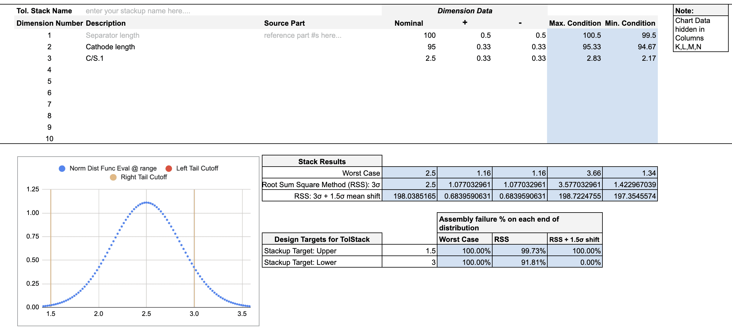 We created tolerance stackup equations to define how individual tolerances stackup with each other. Then, we applied Monte Carlo simulations to generate the output distribution of assembly dimensions. This distribution was converted into a final tolerance that we could compare against our DFMEA.