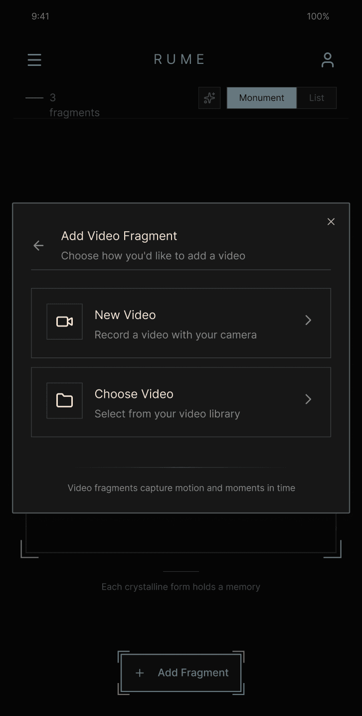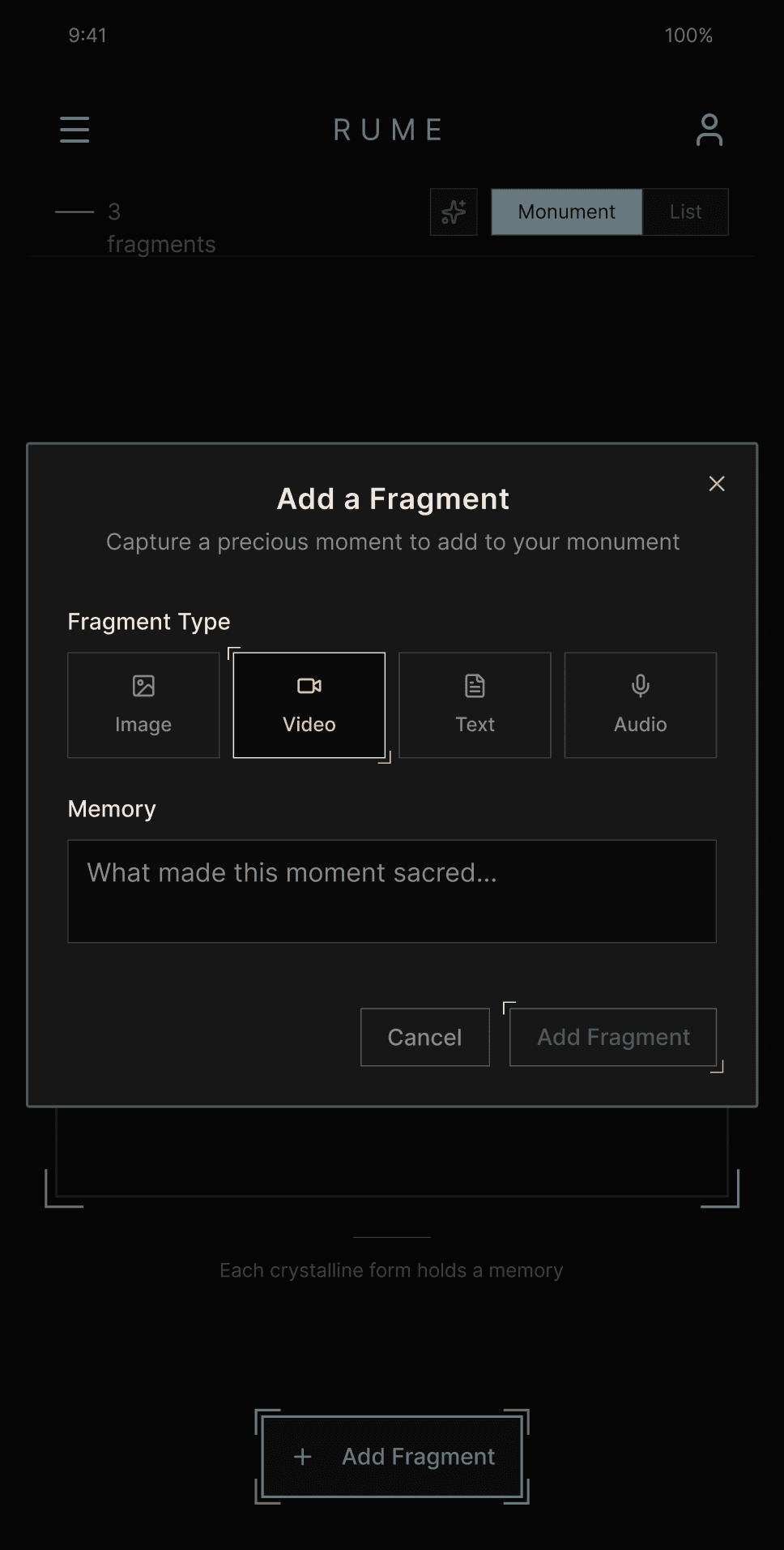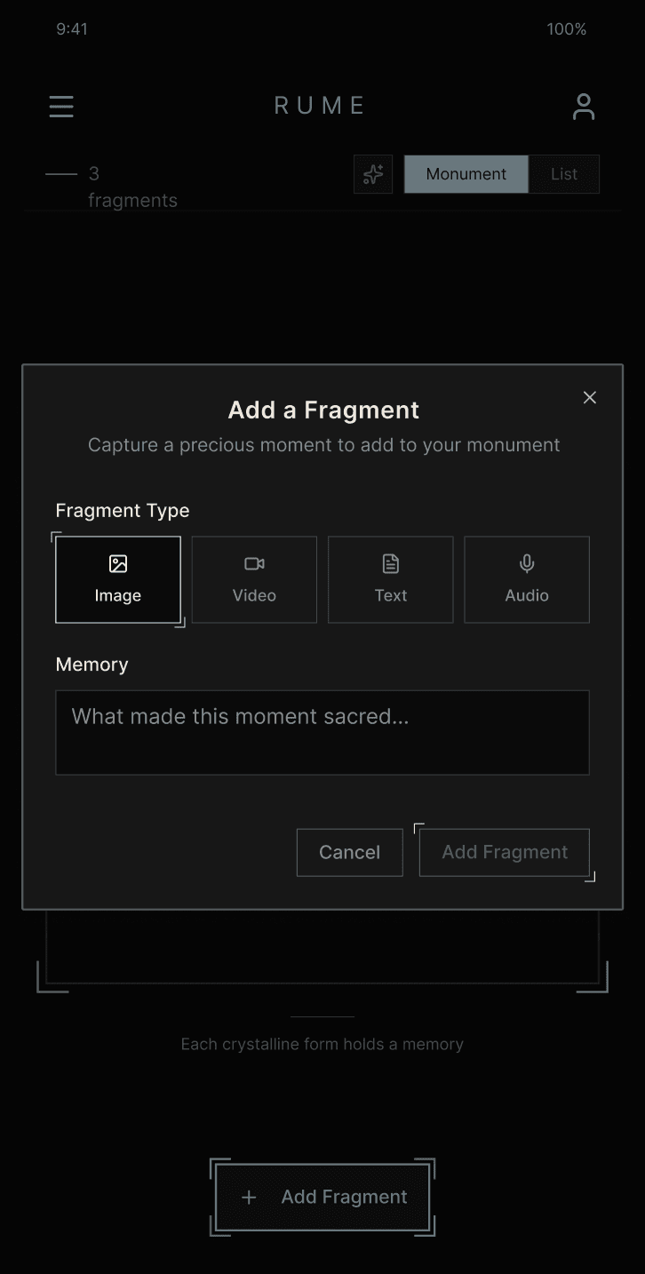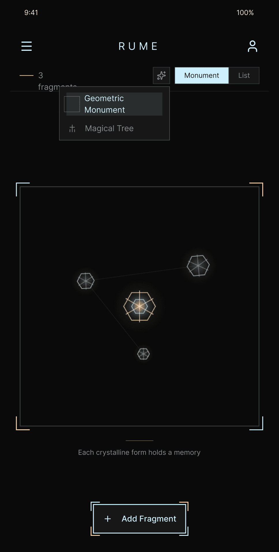 Rume is a memory collection app concept to encourage reflection through objects. We invite users to sift through recommended memories (photos, videos) and preserve them within Rume.